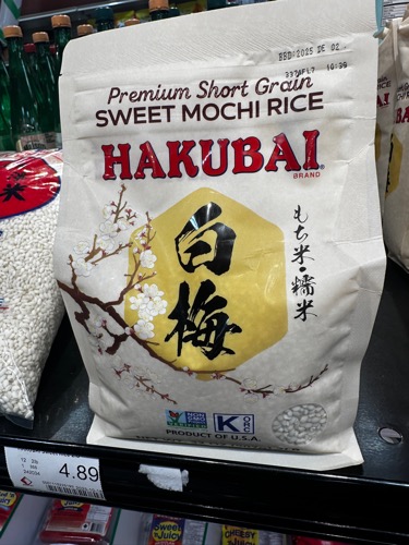 見つけたのは、HAKUBAI SWEET MOCHI RICE。アメリカ・カリフォルニア産の短粒タイプの餅米で、見た目も日本のもち米とほとんど変わりません。